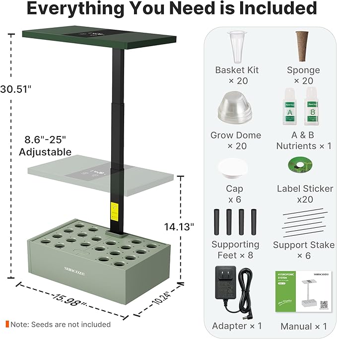 SUNCOZE 20 Pods Hydroponics Growing System Kit, Indoor Herb Garden with Grow Light 30W, 10L Large Water Tank with Adjustable Height to 25", Quiet Pump, Gardening Gifts, Green