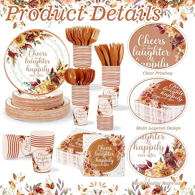 - Boho Fall Wedding Bridal Shower Disposable Tableware Set: The autumn vintage bridal shower party tableware set includes 50 * Disposable paper plates, 50 * Disposable dessert plates, 50 * Disposable cups, 50 * napkins, 50 * knives, 50 * forks, 50 * spoons, 350 pieces in total, and can serve 50 guests at the same time. Meet your daily dining, bride shower, bachelorette party favor, and wedding needs.
