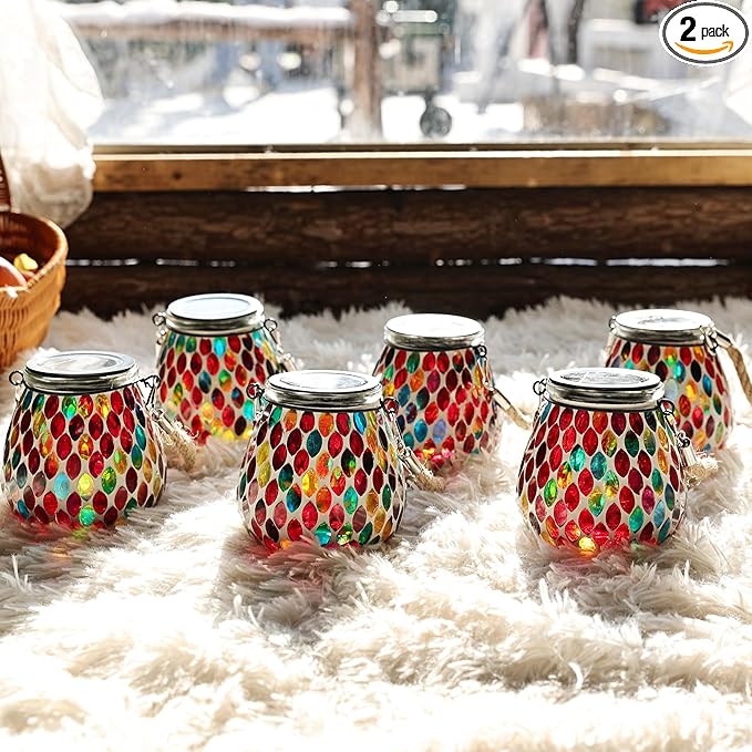 Cooo 2 Pack Mosaic Solar Lantern Outdoor Waterproof IP68 Hanging Projection Light Hidden Lid Pear-Shaped Lantern with Rope Handle Solar Powered Auto On for Patio Garden Fence Table - Crimson Ember