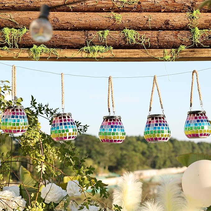Cooo 4 Pack Mosaic Solar Lantern Outdoor Waterproof IP68 Hanging Projection Light Hidden Lid Pear-Shaped Lantern with Rope Handle Solar Powered Auto On for Patio Garden Fence Table - Neon Mosaic