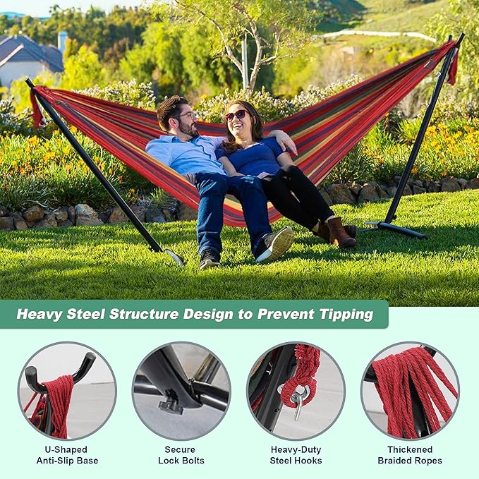 - Built to Last – Strong, Safe, & Supportive Crafted with premium materials, this 2 person hammock with stand is designed for real-life use. No fraying ropes or bending poles—just a durable, reliable frame and thick, comfortable fabric that supports up to 600lbs. Ideal for camping hammocks for adults, couples, or just you and your pup