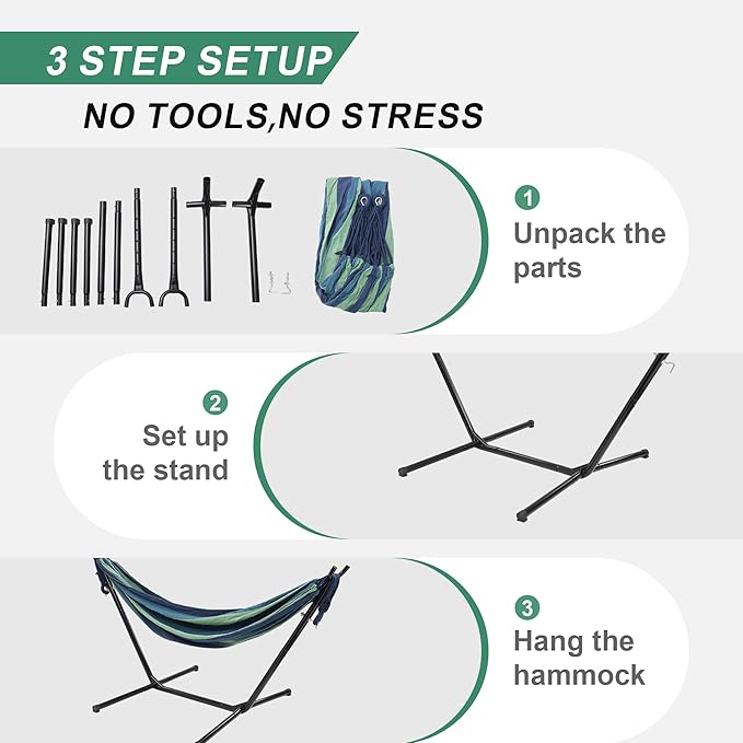 - Quick & Easy Setup – No Tools, No Stress Spend more time relaxing and less time assembling. This free standing hammock sets up in minutes without tools. Whether you're placing it on a patio or taking it camping, the portable hammock stand folds and unfolds effortlessly, giving you that chill vibe instantly