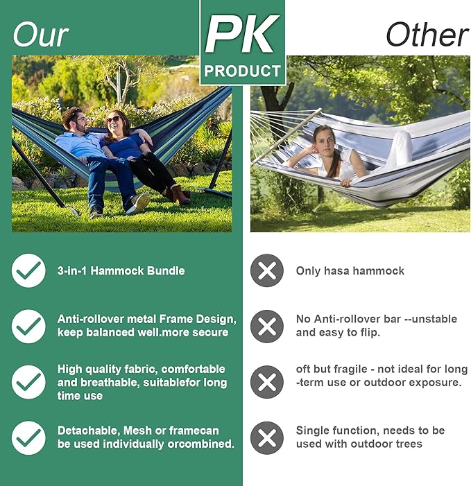 - 3-in-1 Hammock Bundle:Hammock, Stand & Carry Bag Skip the hassle of separate purchases—this hammock with stand for outside comes complete with a heavy-duty steel frame and a portable storage bag for easy transport. Whether you’re heading to the backyard, campsite, or even setting up indoors, this outdoor hammock with stand makes it a breeze to unwind in style