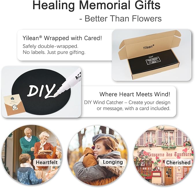 - Modern Minimal Style: Yilean circular wind chimes stand out from other designs due to its unique ability to create a harmonious and balanced sound.Circular wind chimes apart is their ability to naturally catch the wind from any direction. With each gentle breeze, this memorial wind chime will play beautiful melodies, perfect as a decorative keepsake, Mother's Day, birthday greeting or Christmas. There is a beautiful sympathy card for you to write your condolences or blessings.