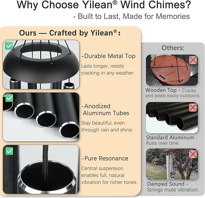 - Premium Material: Yilean memorial wind chimes constructed with a rustproof metal top, durable nylon rope, anodized aluminum tubes and a sturdy S-shaped hook. 5 silver aluminum tubes are professionally anodized finished, which can keep wind chimes beautiful for a long time, not fade, not rust, and durable, and can withstand all kinds of bad weather. (Tip: if you encounter tornadoes or other extreme weather, please remove the wind chimes in time, so as not to be blown away)