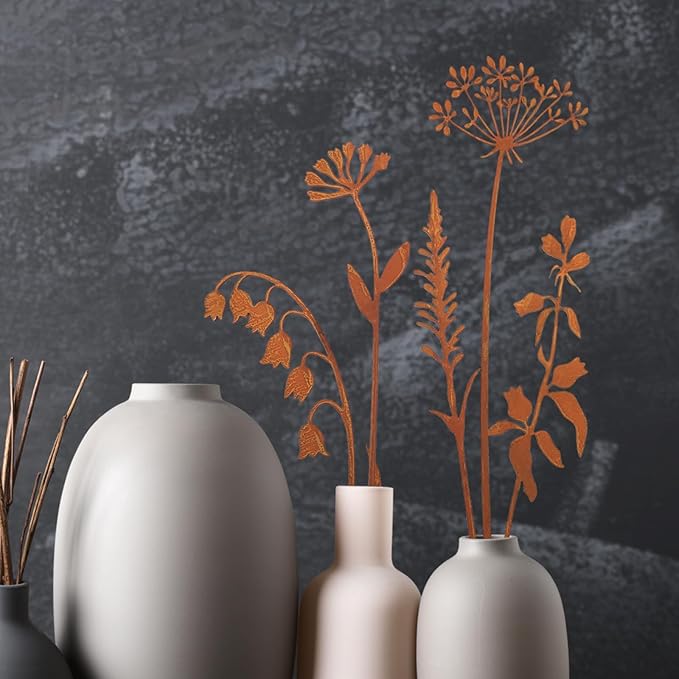 - METAL FLOWERS STAKES:This is a set of 5 decorative garden stakes , Product Dimensions measuring approximately 3x14inches。 This artistic metal a stunning focal point, perfect for gardens, yards, flower beds, fronts, or patios.Metal flowers for outside Made of durable metal and then rusted to give a beautiful vintage look.