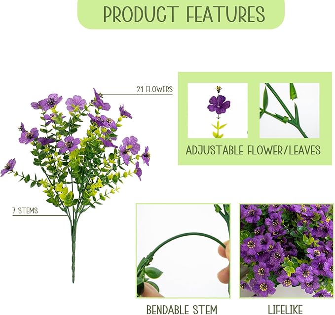 - š[10 Bundle Artificial Flowers Set]-Each bundle includes 7 flexible stems and 21 lifelike fake flowers (purple). Opened, just fluff up the branches and spread everything out.These outdoor faux plants are full enough and beautiful. Flowers and leaves can be detached.