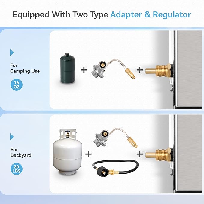 - Save Money- No Need Buy Extra Regulator: Provide a regulator to use it with a small 1LB LP bottle, and a hose with an adapter on it to use a 20LB LP tank. This flat top griddle makes cooking on-the-go easy and yum!