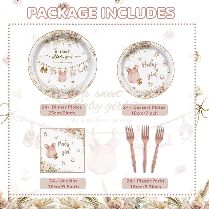 - 【Up to 24 Guests】You will get Baby girl Party Supplies, each set of 24pcs 9'' dinner paper plates, 24pcs 7'' dessert plates, 24pcs paper napkins, 24 plastic forks.