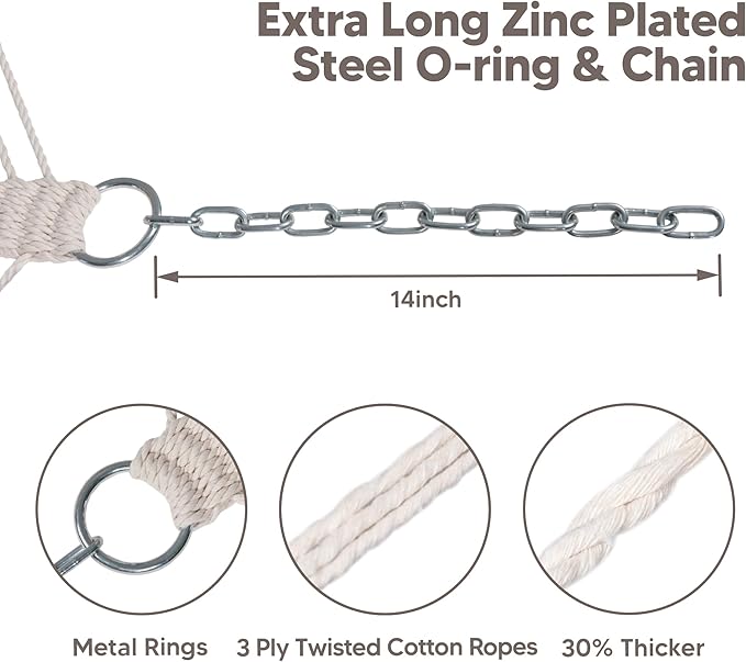 - Upgraded 30% Thicker Ropes: The upgraded strong poly-cotton ropes are hand-woven with comfortable, long-lasting threads woven by the hammock artisans, 30% thicker than before. The 20 ropes are collected together and woven into a triangle pattern which is pleasing to the eye. O-shaped steel ring attaches the ropes and the chain