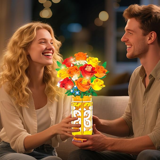- 【A Warm, Glowing Embrace】Beautify your home decor with a soft LED light strip. Wrap it gently around the stems to this flowers bouquet building blocks toys with a warm, golden glow. With a simple touch, watch as light radiates through the textured petals after dark—the yellow roses emanating sunny cheer and the orange blooms glowing with fiery warmth—transforming your arrangement into a dreamy, luminous centerpiece that turns any ordinary night into something magical.