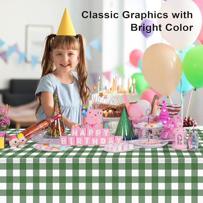 - 【Enjoy Your Party】The sage green plastic table cloths for parties disposable features a sage green theme to add a fun pop of color to every of your gatherings. Impress your guests throughout the party. When the party is over, you can spend more time with family or friends and less time cleaning up. A sage green and white checkered tablecloth is a beautiful addition to any party or event