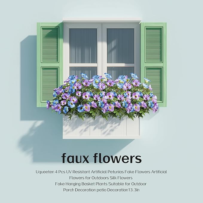 - Color and Size: The package contains 4 pieces our Uqueeten artificial petunias, available in blue, Rose red, white, dark purple, yellow, light purple, blue purple, mixed colors (mixed colors include white, rose red, light purple, blue purple).Each artificial outdoor flowers has about 10 blooming flowers, 5 branches, and 35 leaves.The veins of each leaf are clear, and the serrations on the edge of the leaf are clearly visible.The height of each faux flowers is approximately 13.3 inches.