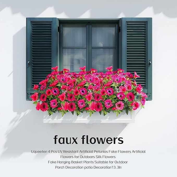 4 Pcs UV Resistant Artificial Petunias Fake Flowers Artificial Flowers for Outdoors Silk Flowers Fake Hanging Basket Plants Suitable for Outdoor Porch Decoration patio Decor 13.3In (Rose red)