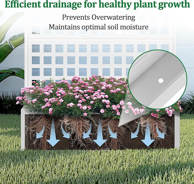 - Optimal Water Management: The planter with trellis features a deep planting bed, offering generous space for healthy root development. The raised garden bed also comes with built-in drainage holes that efficiently prevent water accumulation, helping your plants maintain proper moisture levels for optimal growth.