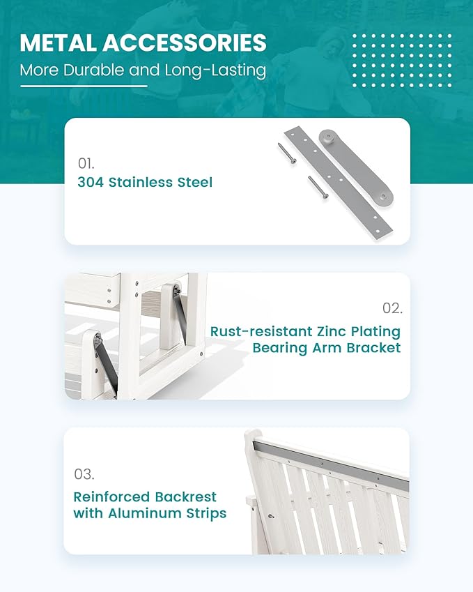 - [All Weather Resistant] Made with durable HDPE material and stainless steel hardware, the SERWALL glider rocking chair is built to withstand all weather conditions, ensuring long-lasting durability. The easy-to-clean surface and ability to swing add an extra level of comfort to your outdoor space, making it ideal for use in any outdoor setting.