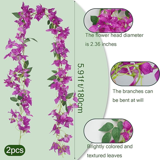 - Beautiful focus: The bright purple flowers of the hanging flowers for decoration contrast with the emerald green leaves, which is eye-catching. A total of 2pcs, each 1 length is 5.91 FT/180 cm. Purple bougainvillea is ideal for cascading green plants. It has long flowing stems and branches covered with flowers, which are very suitable for hanging in hanging baskets or tall shelves.