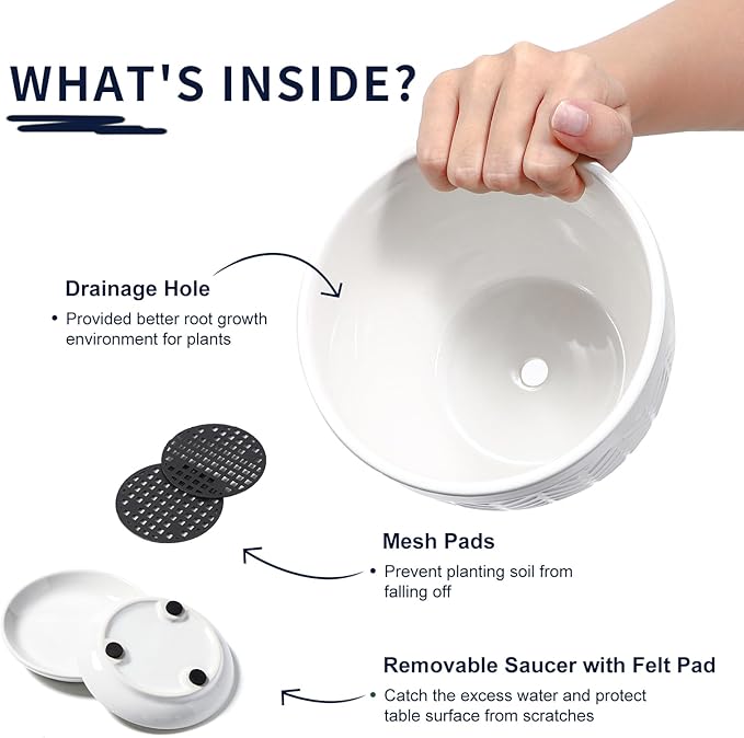 - Helps Plants Thrive: Our ceramic planters include mesh pads and drip trays; The saucers catch excess water, while the mesh pads prevent soil from clogging the drainage holes and keep them clear; This setup improves drainage and root health—perfect for beginners who want their plants to grow strong and healthy