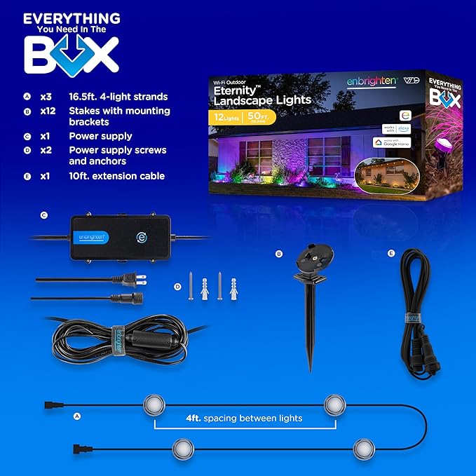- Smart App — Pair to your 2.4GHz Wi-Fi through the Enbrighten app to accentuate your home with millions of color combinations, modes and effects plus schedules, automations and individual LED control create unique outdoor holiday décor or accent lighting