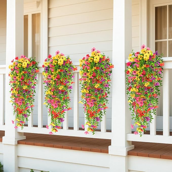 8PCS Artificial Hanging Flowers for Outdoors,Hanging Outdoor Faux Plants,UV Resistant Fake Flowers for Outdoor Planters,Realistic Fake Plants Spring Decor for Porch,Patio,Yard (RedYellowPurple)