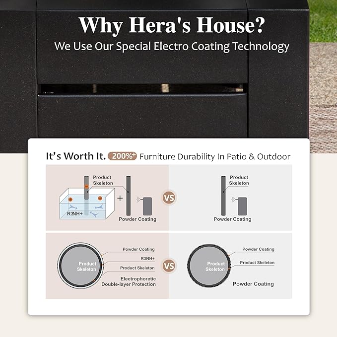 - 【E-Coating & Powder-Coating Technology】All the HERA'S HOUSE metal frame of patio furniture sets are processed by high-performance E-COATING and POWDER-COATING technique which provides extended protection against rust, scratches, rain, and UV harm. All weather resistant, anti-rust, easy to clean, no special care needed