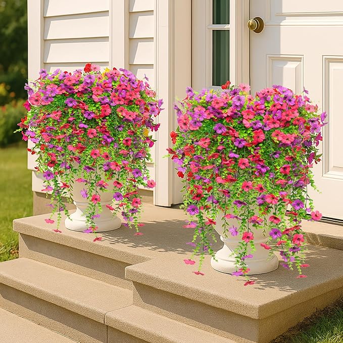 8PCS Artificial Hanging Flowers for Outdoors,Hanging Outdoor Faux Plants,UV Resistant Fake Flowers for Outdoor Planters,Realistic Fake Plants Spring Decor for Porch,Patio,Yard (RedPurple)