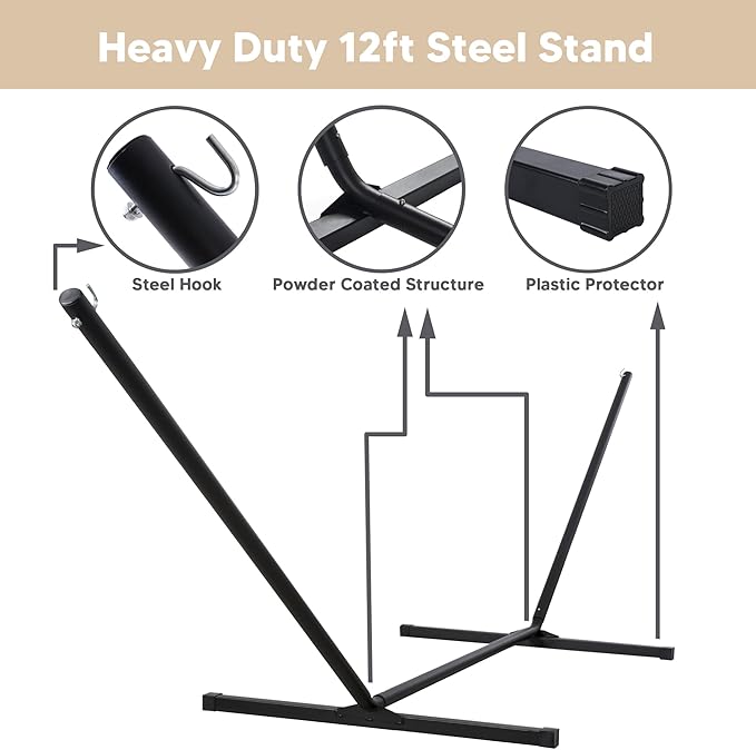 - Hammock with Portable Stand: No damage to trees. Created to be stable and long-lasting, the 12 ft stand is made from powder-coated heavy gauge steel. It can be easily assembled in minutes without any tools, and it could be disassembled easily, making it to be a portable hammock. Feel free to contact us if you have any questions during use within one year of purchase. We are always here to help