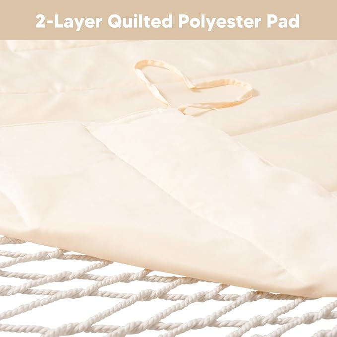 - Cotton Rope Hammock: The heavy duty cotton ropes are hand-woven with comfortable, long-lasting thread woven by hammock artisans. When you lay on the rope hammock, it helps you relieve stress and provide better blood circulation throughout the body. And thanks to the well ventilated mesh, your back won’t be sweaty anymore