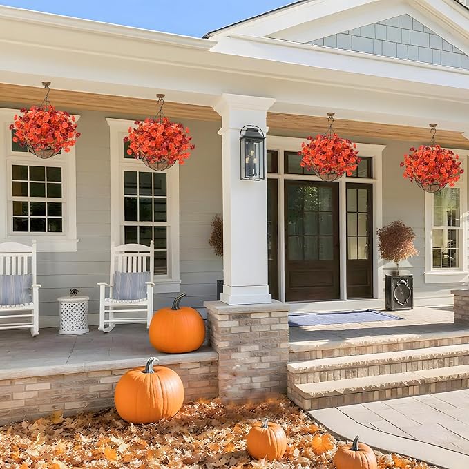 - Fall Decorations Hanging Artificial Flowers for Outdoors: Perfect for porch, yard, balcony, front door, and garden. The bold orange and dark red tones evoke a cozy fall atmosphere, making them ideal for seasonal and everyday decor alike