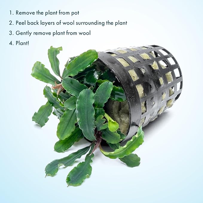 - Ships potted for fast placement—simply remove and attach to hardscape with glue or thread. Keep the rhizome above substrate to avoid rot and promote strong anchoring and healthy new shoots.