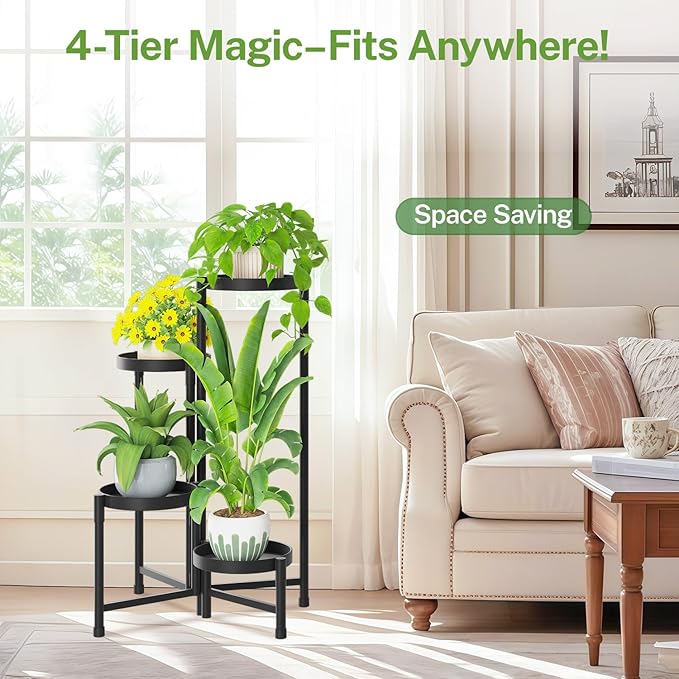 iDavosic.ly Plant Stand Indoor Outdoor, 4 Tier Corner Metal Flower Display Holder Shelf, Folding Tall Orchid Rack for Patio Balcony Porch Garden Living Room House, Black