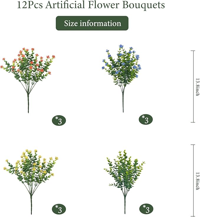 - You will get 12 Bundles artificial flowers, these flowers are handmade to offer a more unique look in every bundle. Each bouquet has 7 flexible stems and bushy leaves. Each measures 14" high x 9" Wide