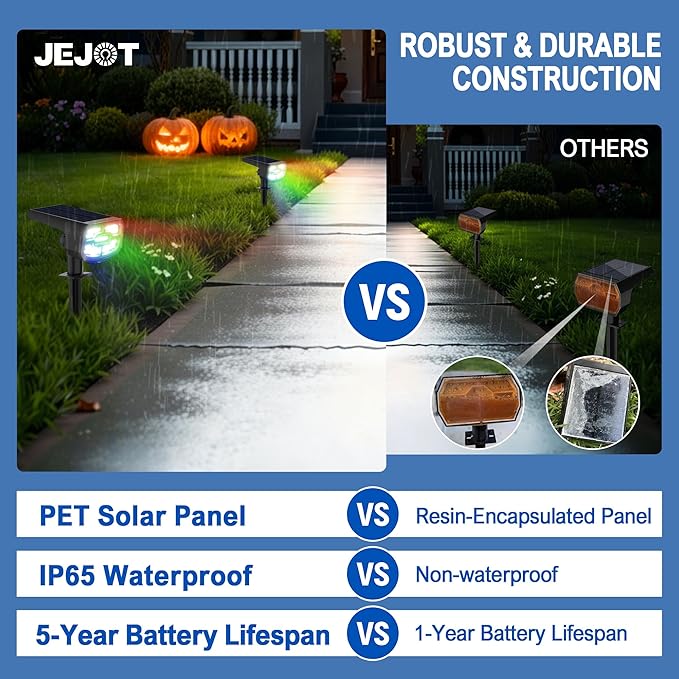 - 🎃2-in-1 Easy Installation: JEJOT solar color changing lights outdoor combine landscape and wall lighting with no wiring needed. Easily place them throughout your Halloween courtyard to illuminate pumpkin displays and ghost decorations. They create a mysteriously thrilling atmosphere that will immerse your guests in an unforgettable Halloween night experience.