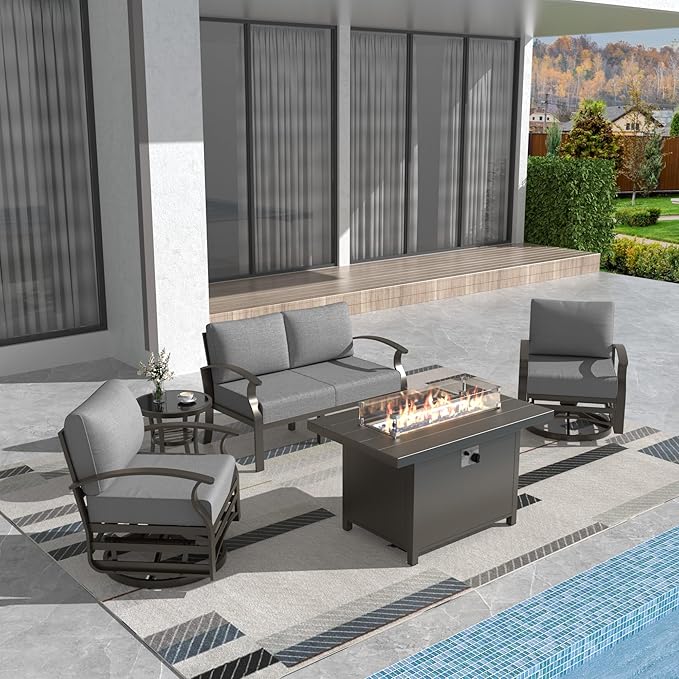 Kurapika Aluminum Patio Furniture Set 4-Seat Modern Metal Outdoor Conversation Sets w/45in Propane Fire Pit Table, Loveseat Sofa,Swivel Rocking Chairs w/5.1 Inch Cushion, Grey