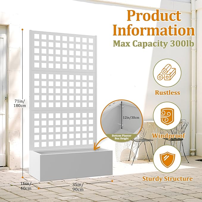 - 🛡️【Outdoor Privacy Screen & Metal Planter Box with Trellis】Use this metal planter box with trellis to create a natural divider on your patio, balcony, or yard. It’s more than just a garden raised bed for climbing plants—it’s also a beautiful metal planter with privacy screen that offers shade and separation. The sleek black frame and vertical lines of this metal planter box with trellis make it both decorative and practical.