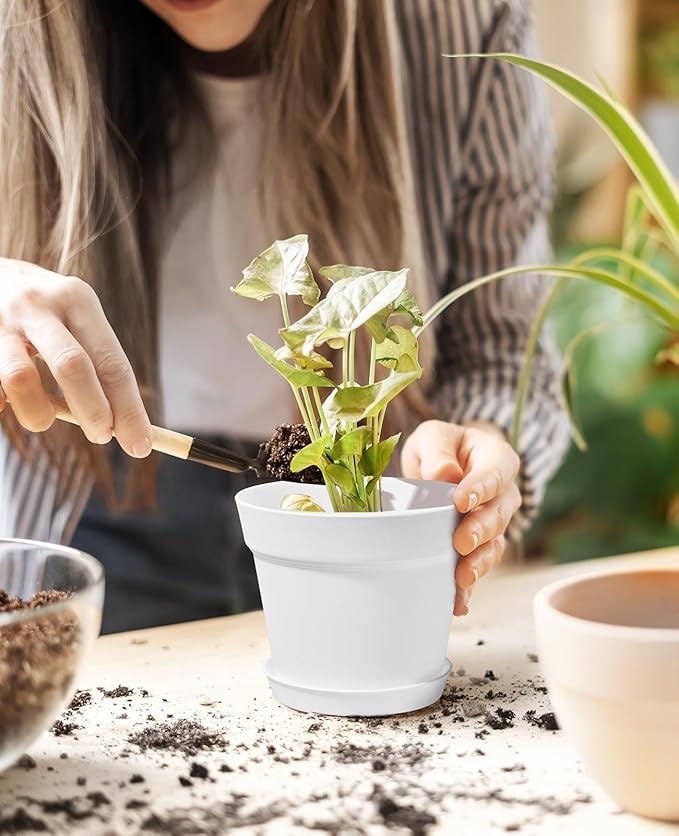 - 【Excellent Drainage System and Matching Tray】The porous drainage design of this plastic plant pots solves the drainage problem,and the small holes of arranged at the bottom can ensure that the drainage system will not be blocked and it also will not cause soil leakage.And pots for plants are provided a removable tray to collect excess water without worrying about leaks and damage to the floor,perfect for indoor use.