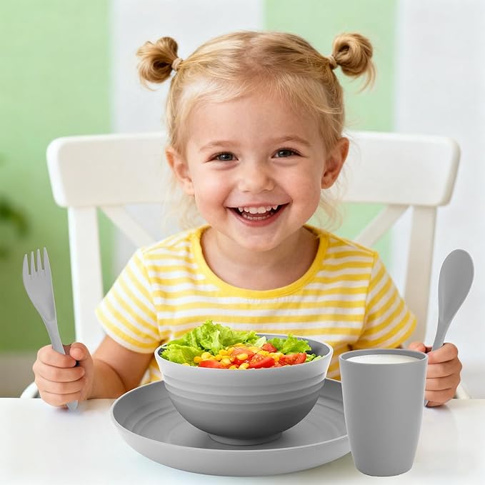 - 4-Person Dinnerware Set: This 20pcs gray wheat straw dinnerware set serves 4, including everything needed for daily meals: 4 dinner plates(9"), 4 cereal bowls(26 oz), 4 cups (12 oz), 4 forks and 4 spoons - perfect for daily meals or entertaining.