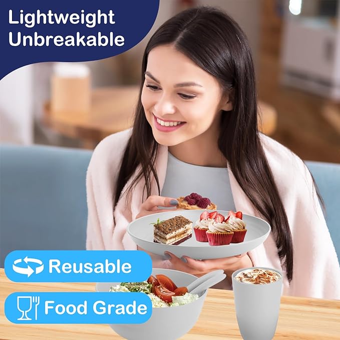 - Material & Durability: Made of premium wheat straw fiber and plastic material, this BPA-free dish set ensures safe daily use. Unlike porcelain or ceramic, its strudy build withstands drops, making it ideal for homes and outdoor uses.