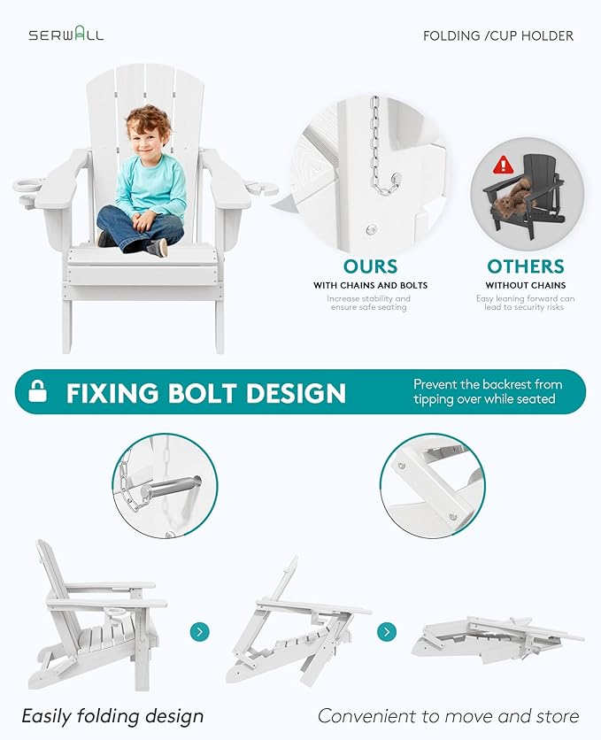 - Folding Design: Are you still struggling with the size of adirondack chair? This adirondack chair can be stored away easily. Buy SERWALL folding adirondack chairs to save space in your home!