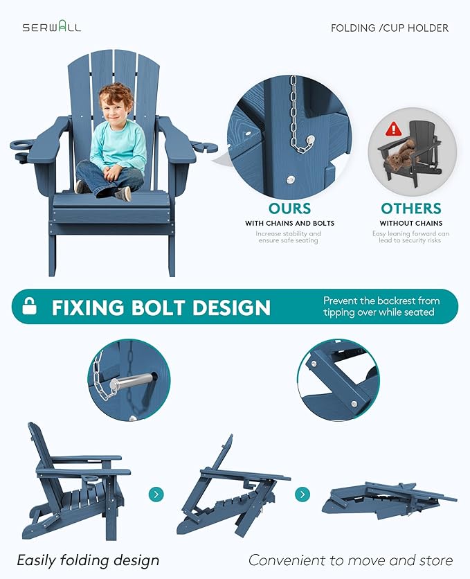 - Folding Design: Are you still struggling with the size of adirondack chair? This adirondack chair can be stored away easily. Buy SERWALL folding adirondack chairs to save space in your home!