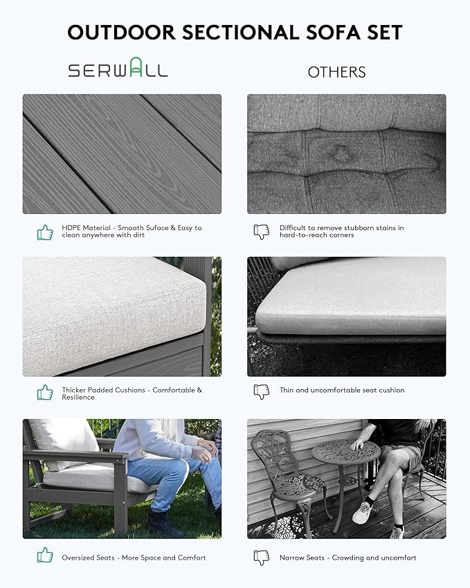 - 1000 Days Trial: Your satisfaction is our top priority. We are committed to providing excellent customer service and support. Each of our 6-piece patio sofa sets comes with SERWALL's assurance of quality and customer satisfaction. If you have any questions or concerns, our dedicated customer service team is ready to assist you.