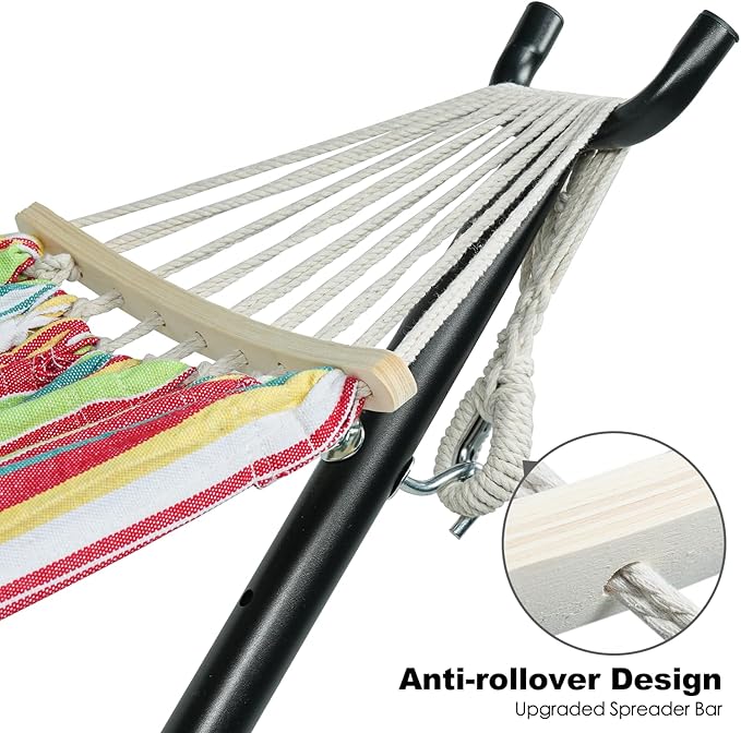 - ✅ANTI-ROLLOVER SPREADER BAR: Upgraded hammocks with anti-rollover curved spreader bars design, the 9 thicker cotton ropes are evenly distributed to make the hammock more stable, ensuring a balanced sleeping experience.