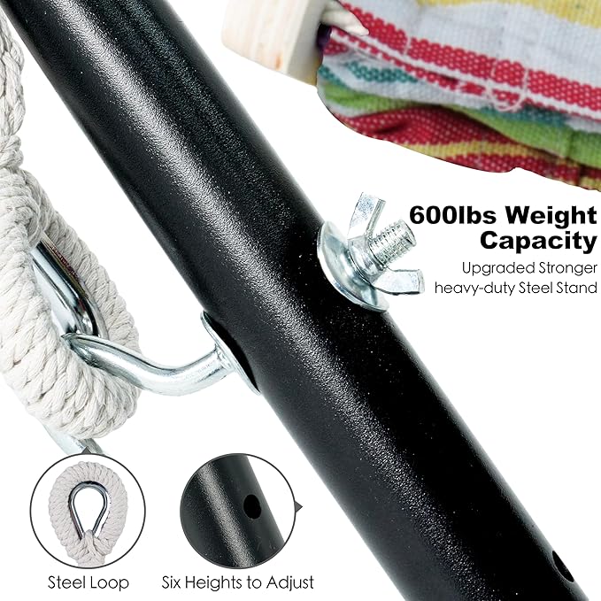 - ✅ASSEMBLES IN MINUTES: Easy to use without any tools, just align the stnad holes, tighten the knob and hang the hammock.Embrace the beauty and joy that this colorful masterpiece brings, and let it become the centerpiece of your relaxation oasis.