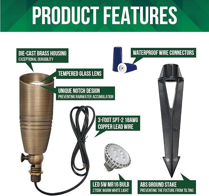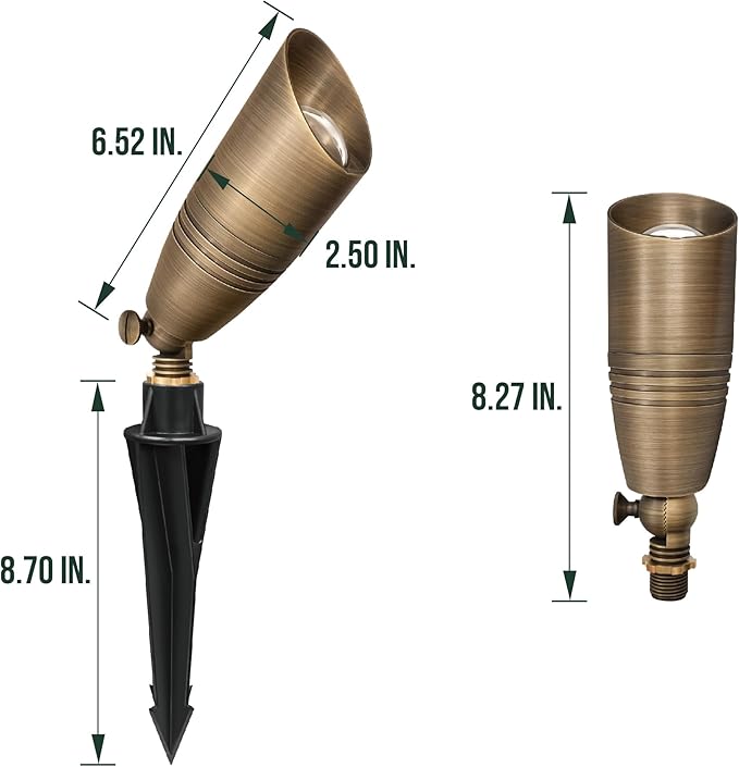 - Premium Solid Brass Construction – Crafted from heavy-duty die-cast brass, this outdoor spotlight develops a beautiful natural patina over time, blending durability with timeless elegance for garden & landscape lighting.