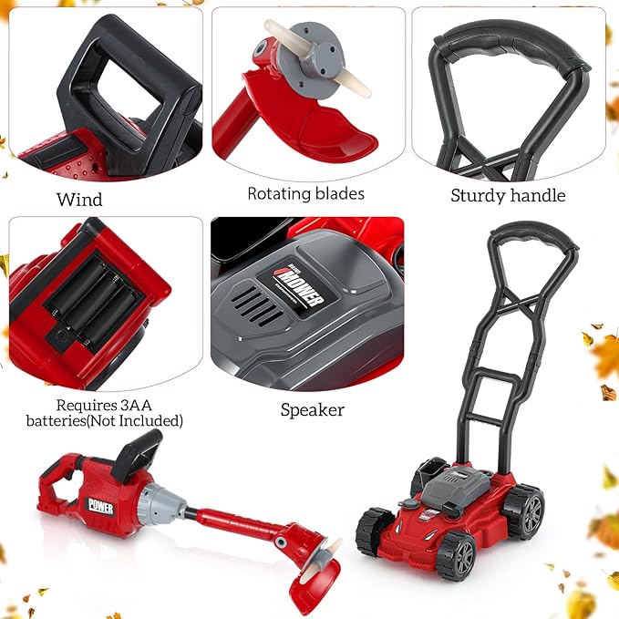 - Complete Play Tool Set: our lawn equipment toys set is a nice bundle to keep them entertained and engaged; The set includes a toy weed trimmer and a push lawn mower, all designed to match real world models; In bold red and black colors