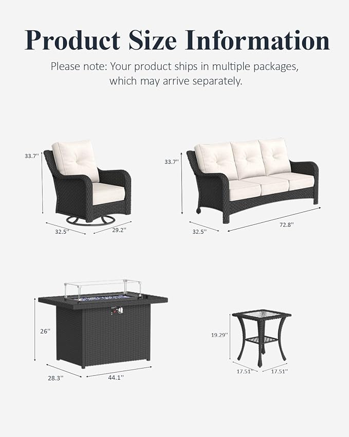 LayinSun 5 Piece Wicker Outdoor Furniture Set with 6-inch Comfy Cushions, High Back Patio Furniture Set with Swivel Rocking Chairs and Fire Pit Table