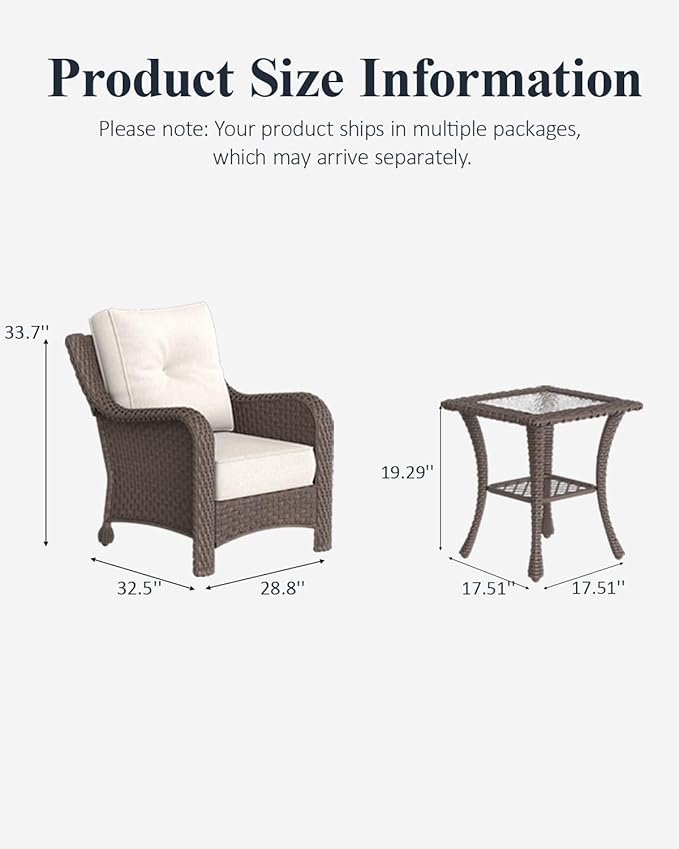 LayinSun 3 Piece Wicker Outdoor Furniture Set with 6-inch Comfy Cushions, High Back Patio Furniture Set with Rattan Armchairs and Side Table