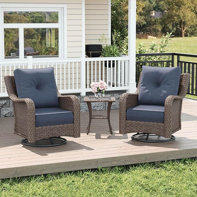 LayinSun 3 Piece Wicker Outdoor Furniture Set with 6-inch Comfy Cushions, High Back Patio Furniture Set with Swivel Rocking Chairs and Side Table