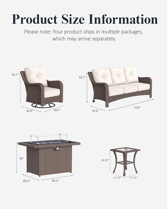 LayinSun 5 Piece Wicker Outdoor Furniture Set with 6-inch Comfy Cushions, High Back Patio Furniture Set with Swivel Rocking Chairs and Fire Pit Table