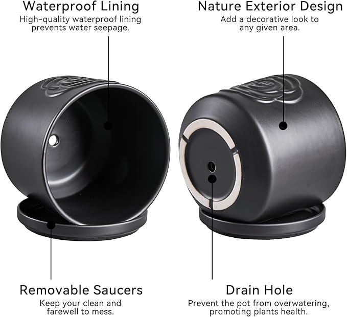 Ekirlin 7 Inch Plant Pots, Ceramic Rose Flower Planters Indoor, Modern Succulents Containers with Drain Hole Saucer, Weatherproof Pot for Home Decorate, Outdoor & Garden (Black)